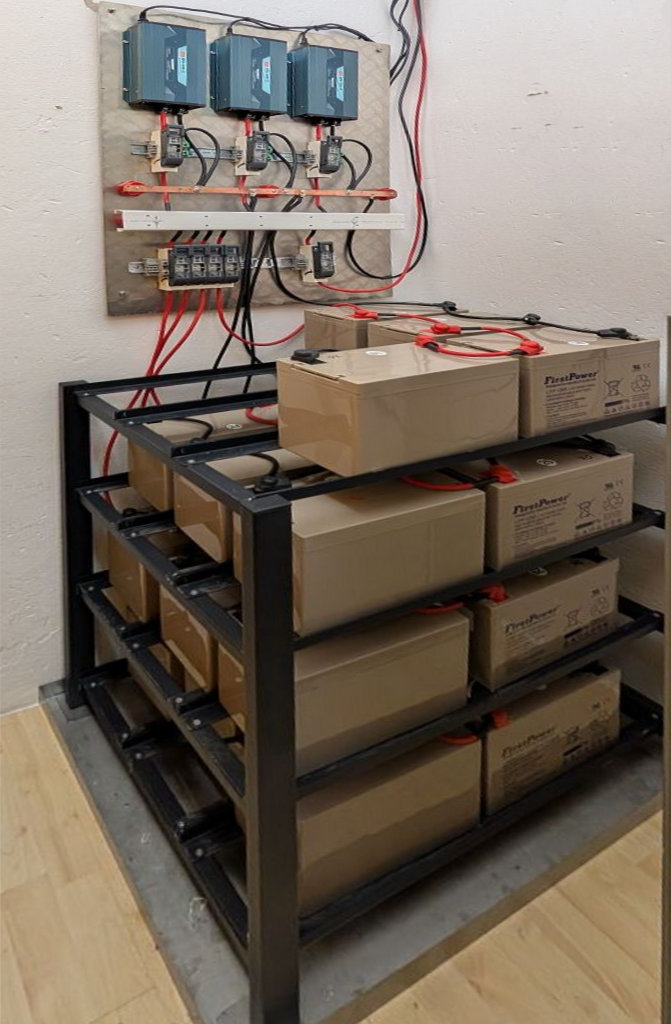 Die Anlage besteht aus 20 parallel geschalteten Blei-Gel Akkus mit einer Gesamtkapazität von ca. 2.000Ah und einer Nennspannung von 12V. Damit kann ein Notstrombetrieb von einer knappen Woche sichergestellt werden. Zu diesem Zweck wird das DB0TR Relais automatisch auf QRP-Betrieb umgeschaltet. Ist der Strom aus dem öffentlichen Netz nach einem Ausfall wieder vorhanden, werden die Akkus zügig mit bis zu 210A wieder aufgeladen.